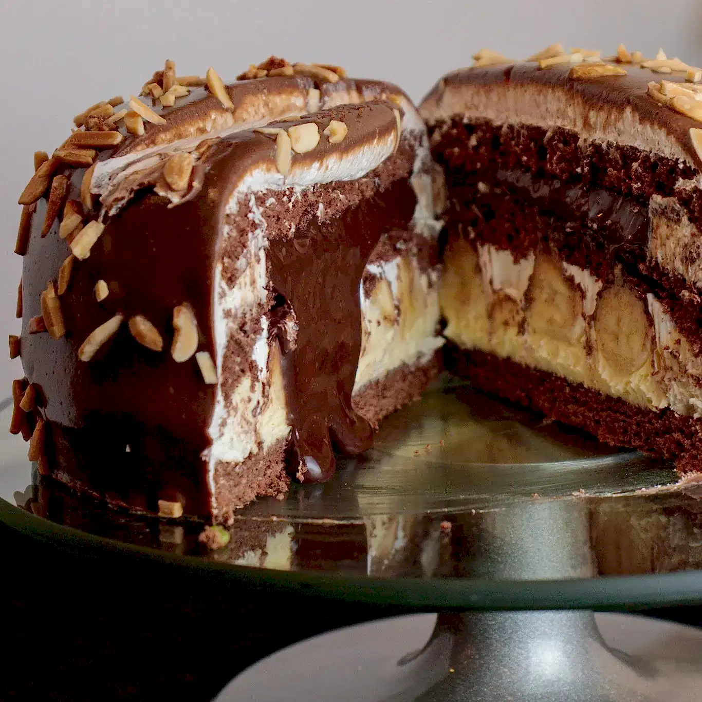 Kakaolu Pandispanya, Sarı Pastacı Kreması, Akışkan Çikolata , Muz ve Dışında Çıtır Kibrit Badem
